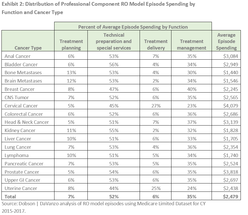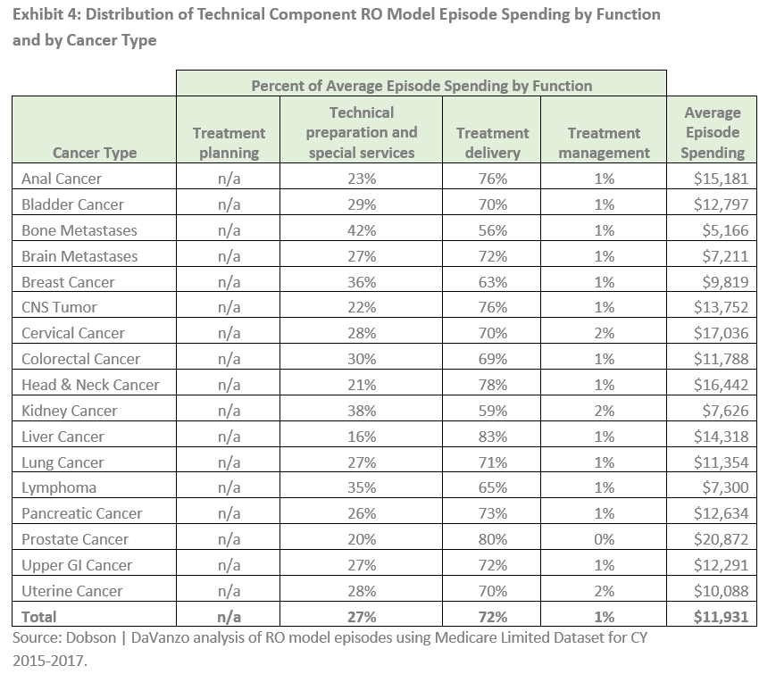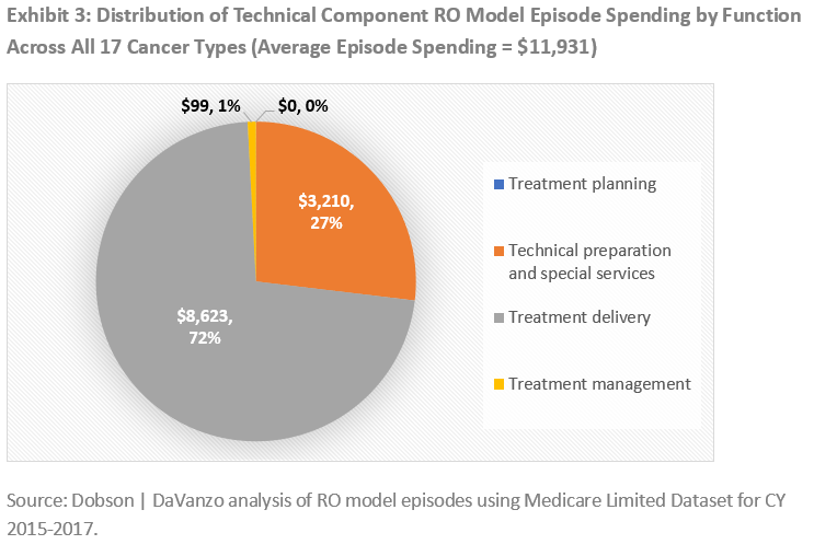 Technical providers that will be subjected to the RO payment model will need to determine where and how a 5-percent savings will be achieved. As these data indicate, providers should first examine their utilization for treatment delivery services as this is the largest spending category. The clinical appropriateness and cost effectiveness of the treatment modality used during the episode (i.e., stereotactic radiosurgery, intensity-modulated radiotherapy, conventional external beam, intraoperative radiotherapy, proton beam therapy, or brachytherapy) will need to be assessed as the cost differences across these modalities are significant and we will address these differences in a later blog post.